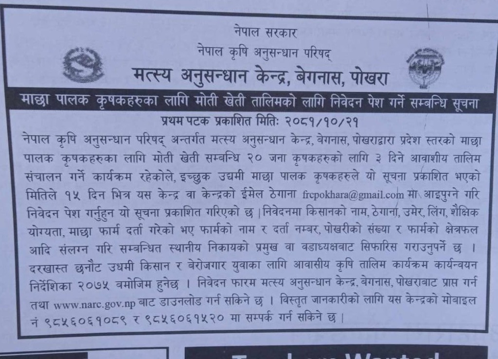 рдорд╛рдЫрд╛ рдкрд╛рд▓рдХ рдХреГрд╖рдХрд╣рд░реБрдХрд╛ рд▓рд╛рдЧрд┐ рдореЛрддреА рдЦреЗрддрд┐ рддрд╛рд▓рд┐рдордХреЛ рд▓рд╛рдЧрд┐ рдирд┐рд╡реЗрджрди рдкреЗрд╢ рдЧрд░реНрдиреЗ рд╕рдореНрдмрдиреНрдзрд┐ рд╕реВрдЪрдирд╛ 2081-10-21 2081-11-06